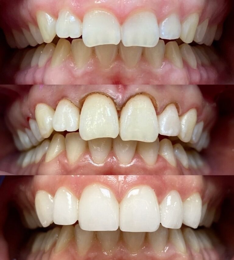 Eén van onze patiënten was ontevreden over de vorm en lengte van haar tanden. Zelf was ze lang maar haar tanden waren kort (bovenste foto). Ook was er veel tandvlees zichtbaar tijdens het lachen. Haar wens: langere en rechte tanden.